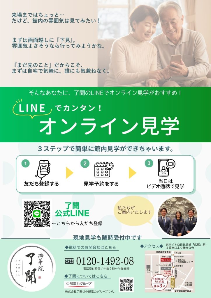 了聞公式LINEより友だち登録していただき、トーク画面より「見学希望」「オンライン見学」とメッセージをお送りいただくか、お電話にてお気軽にお申しつけください。